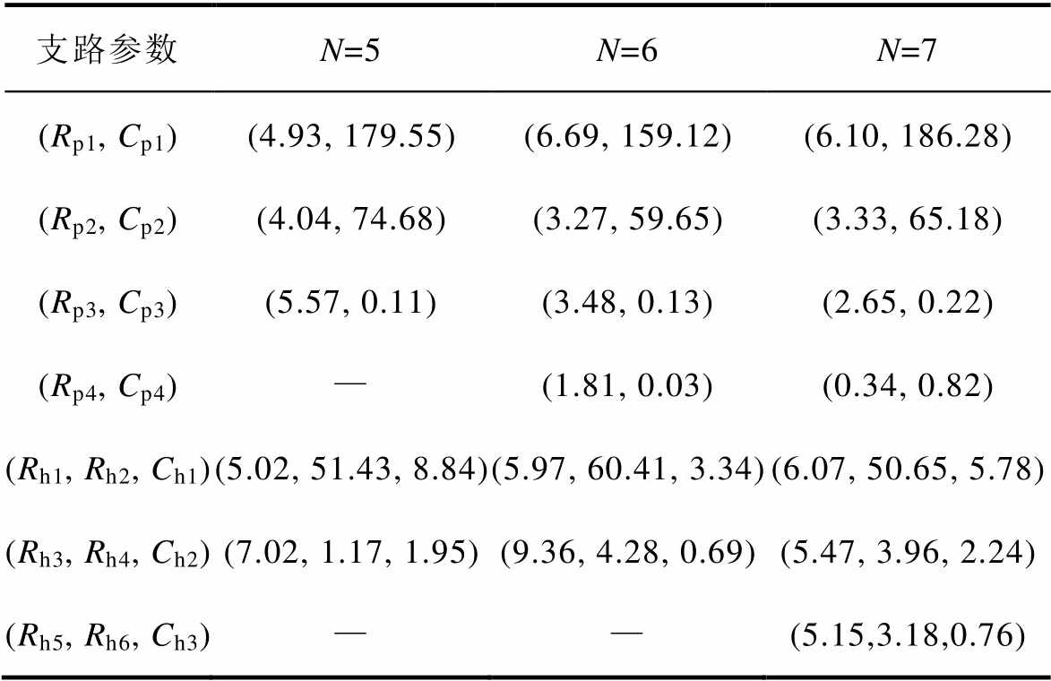 支路参数N=5N=6N=7 (Rp1, Cp1)(4.93, 179.55)(6.69, 159.12)(6.10, 186.28) (Rp2, Cp2)(4.04, 74.68)(3.27, 59.65)(3.33, 65.18) (Rp3, Cp3)(5.57, 0.11)(3.48, 0.13)(2.65, 0.22) (Rp4, Cp4)—(1.81, 0.03)(0.34, 0.82) (Rh1, Rh2, Ch1)(5.02, 51.43, 8.84)(5.97, 60.41, 3.34)(6.07, 50.65, 5.78) (Rh3, Rh4, Ch2)(7.02, 1.17, 1.95)(9.36, 4.28, 0.69)(5.47, 3.96, 2.24) (Rh5, Rh6, Ch3)——(5.15,3.18,0.76)