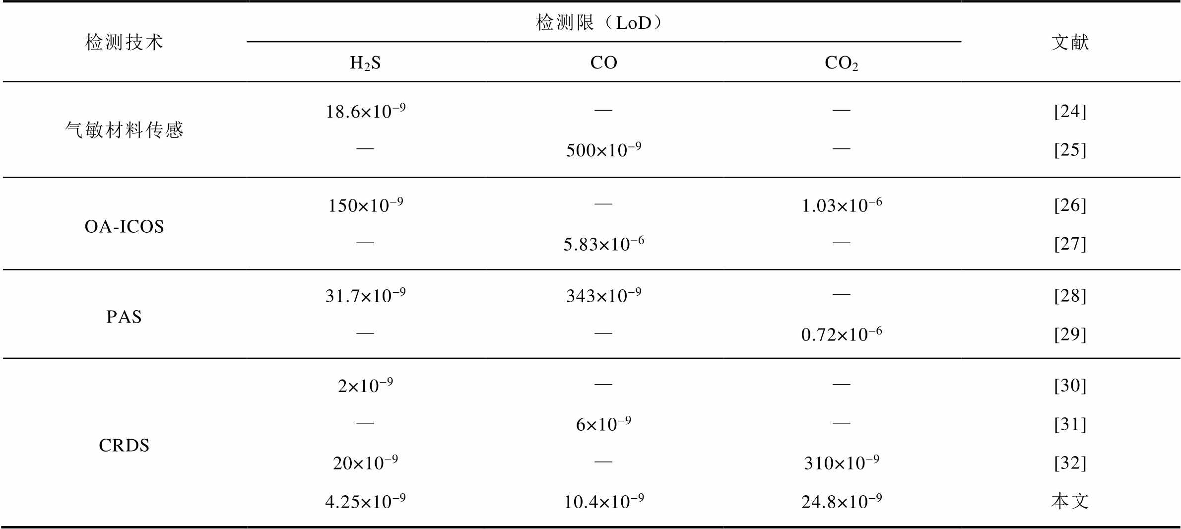 本文对现阶段不同检测技术的检测限进行了对比分析,见表2。目前,主要检测技术包括气敏材料传感、离轴积分腔输出光谱(Off-Axis Integrated Cavity Output Spectroscopy, OA-ICOS)、光声光谱和腔衰荡光谱,腔衰荡光谱在检测精度上具有一定优势。当前检测技术多为针对H2S、CO、CO2其中一种或两种气体,本文提出的基于激光波长调制的腔衰荡光谱技术实现了H2S、CO、CO2三组分的同时检测,检测精度均达到了10-9级。