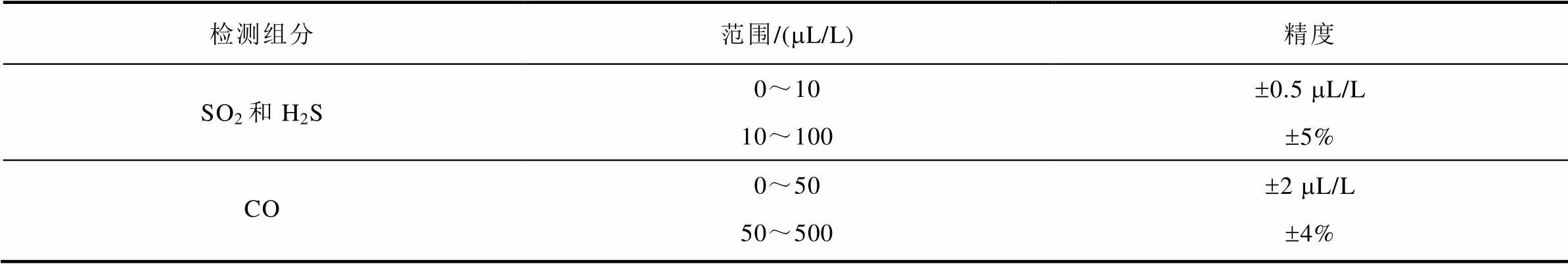 检测组分范围/(mL/L)精度 SO2和H2S0~10±0.5 mL/L 10~100±5% CO0~50±2 mL/L 50~500±4%