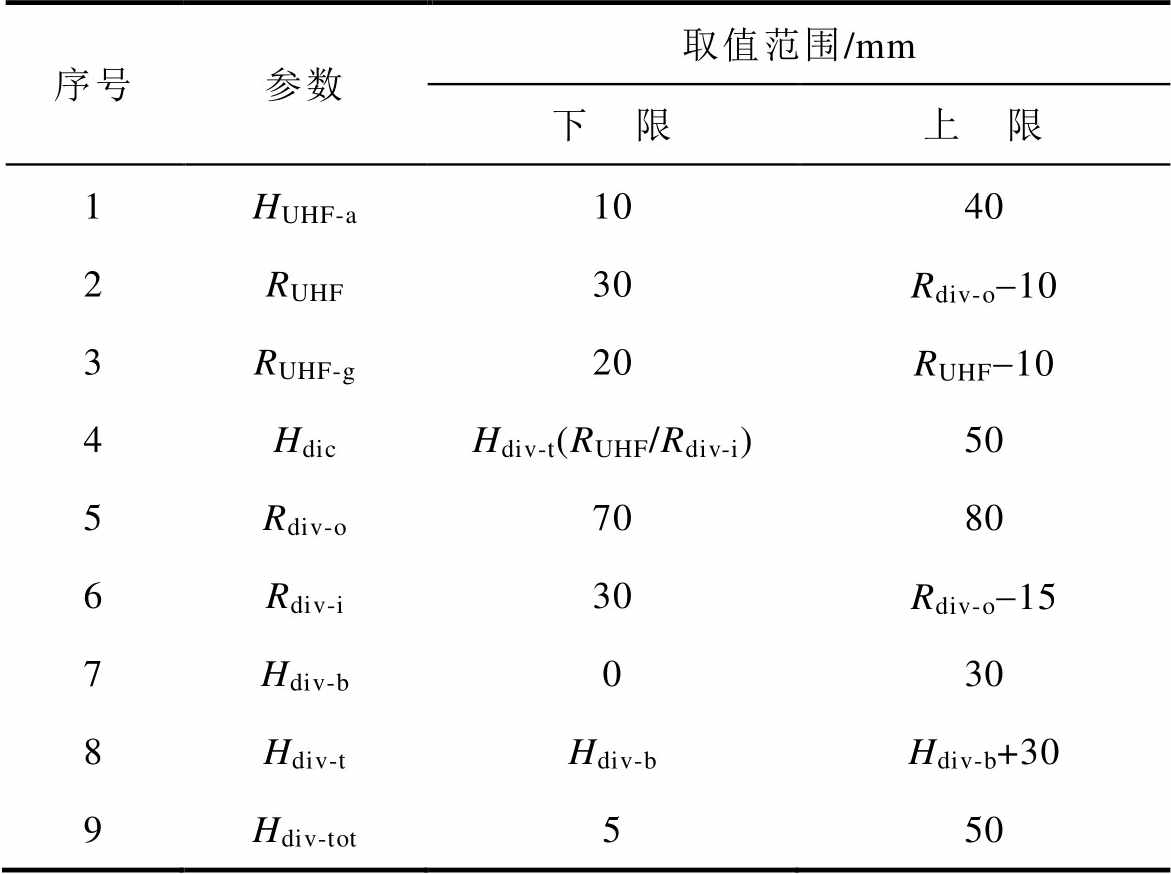 序号参数取值范围/mm 下 限上 限 1HUHF-a1040 2RUHF30Rdiv-o-10 3RUHF-g20RUHF-10 4HdicHdiv-t(RUHF/Rdiv-i)50 5Rdiv-o7080 6Rdiv-i30Rdiv-o-15 7Hdiv-b030 8Hdiv-tHdiv-bHdiv-b+30 9Hdiv-tot550