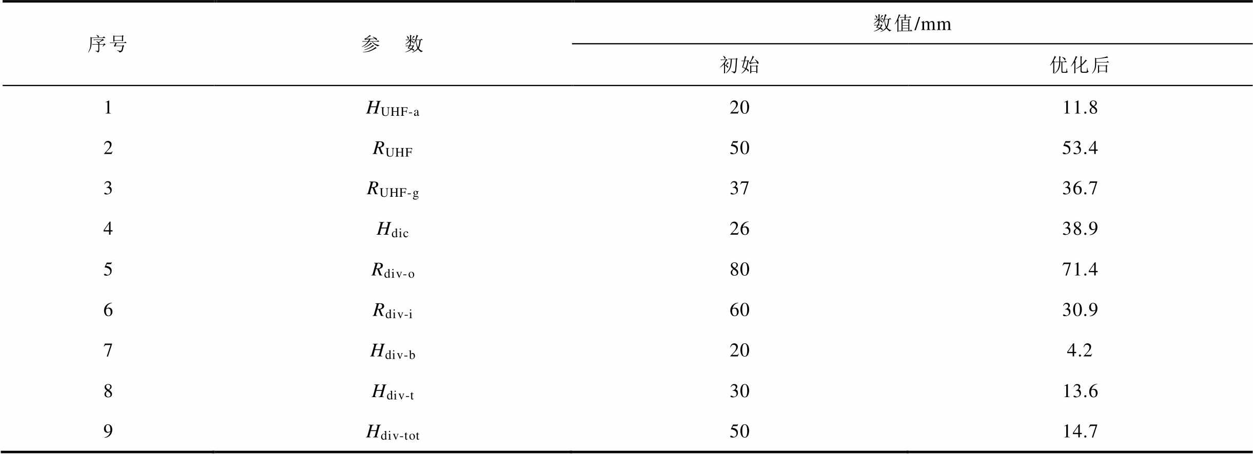 序号参 数数值/mm 初始优化后 1HUHF-a2011.8 2RUHF5053.4 3RUHF-g3736.7 4Hdic2638.9 5Rdiv-o8071.4 6Rdiv-i6030.9 7Hdiv-b204.2 8Hdiv-t3013.6 9Hdiv-tot5014.7