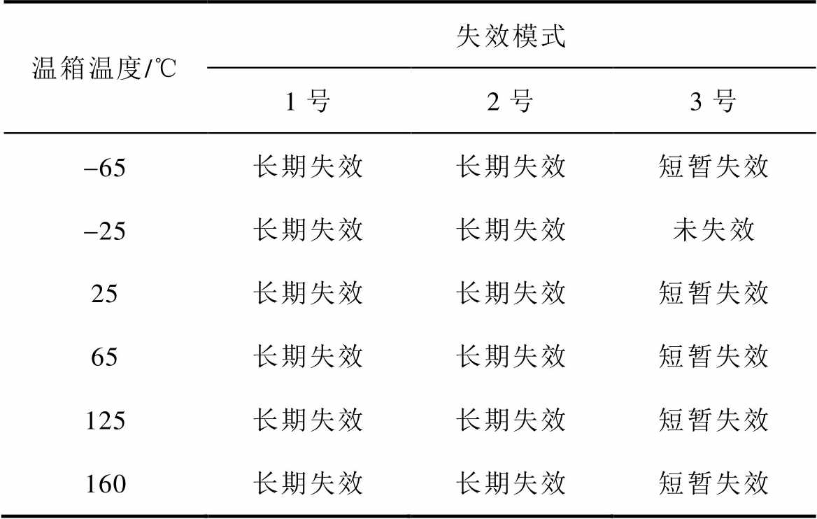 温箱温度/℃失效模式 1号2号3号 -65长期失效长期失效短暂失效 -25长期失效长期失效未失效 25长期失效长期失效短暂失效 65长期失效长期失效短暂失效 125长期失效长期失效短暂失效 160长期失效长期失效短暂失效