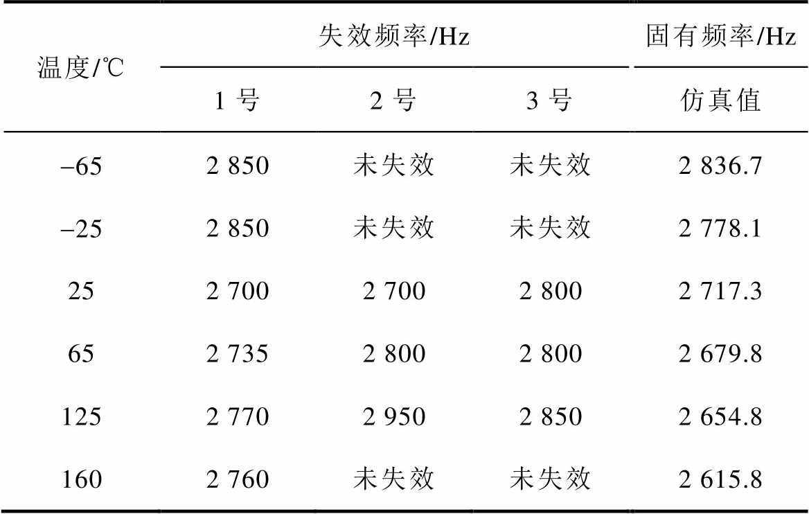 温度/℃失效频率/Hz固有频率/Hz 1号2号3号仿真值 -652 850未失效未失效2 836.7 -252 850未失效未失效2 778.1 252 7002 7002 8002 717.3 652 7352 8002 8002 679.8 1252 7702 9502 8502 654.8 1602 760未失效未失效2 615.8