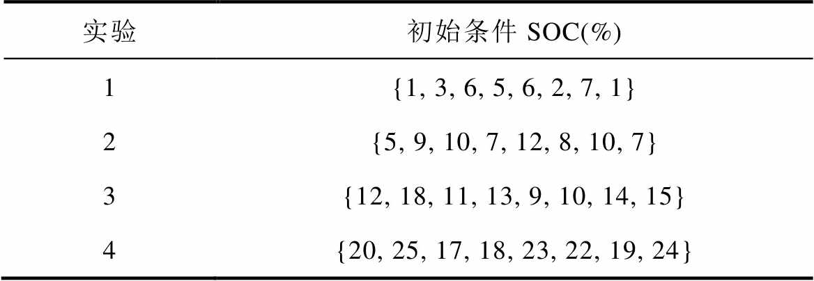实验初始条件SOC(%) 1{1, 3, 6, 5, 6, 2, 7, 1} 2{5, 9, 10, 7, 12, 8, 10, 7} 3{12, 18, 11, 13, 9, 10, 14, 15} 4{20, 25, 17, 18, 23, 22, 19, 24}