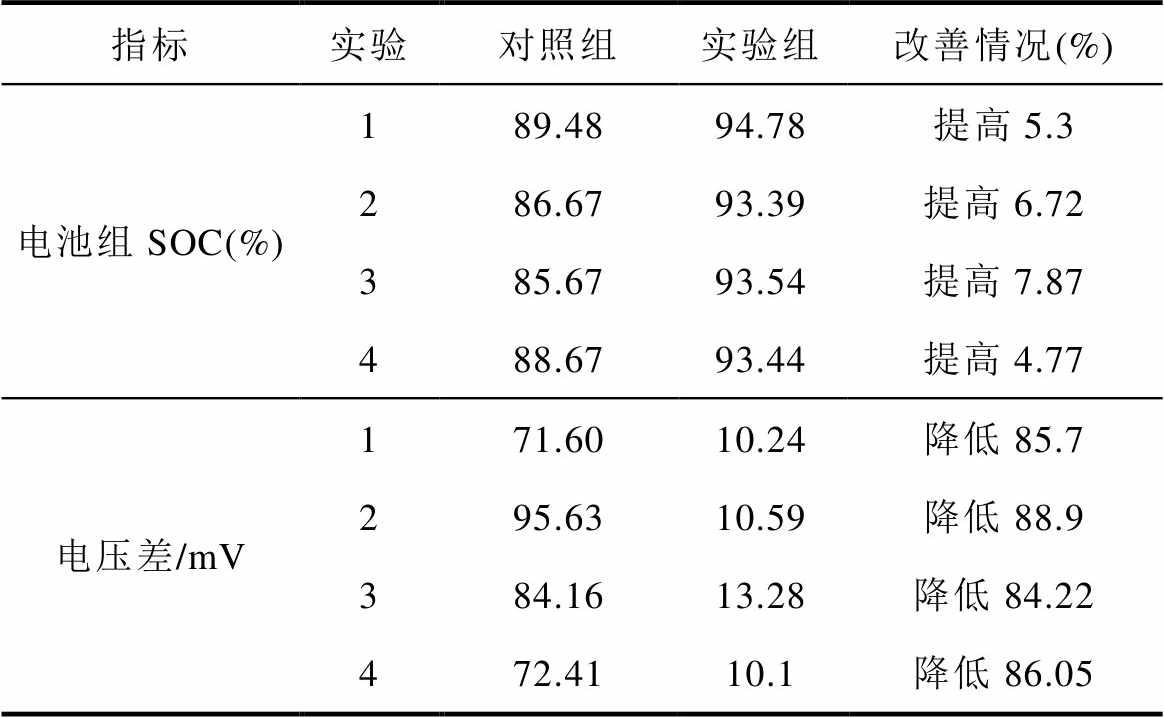 指标实验对照组实验组改善情况(%) 电池组SOC(%)189.4894.78提高5.3 286.6793.39提高6.72 385.6793.54提高7.87 488.6793.44提高4.77 电压差/mV171.6010.24降低85.7 295.6310.59降低88.9 384.1613.28降低84.22 472.4110.1降低86.05