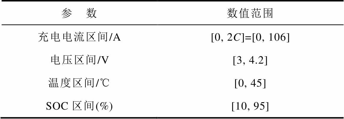参 数数值范围 充电电流区间/A[0, 2C]=[0, 106] 电压区间/V[3, 4.2] 温度区间/℃[0, 45] SOC区间(%)[10, 95]