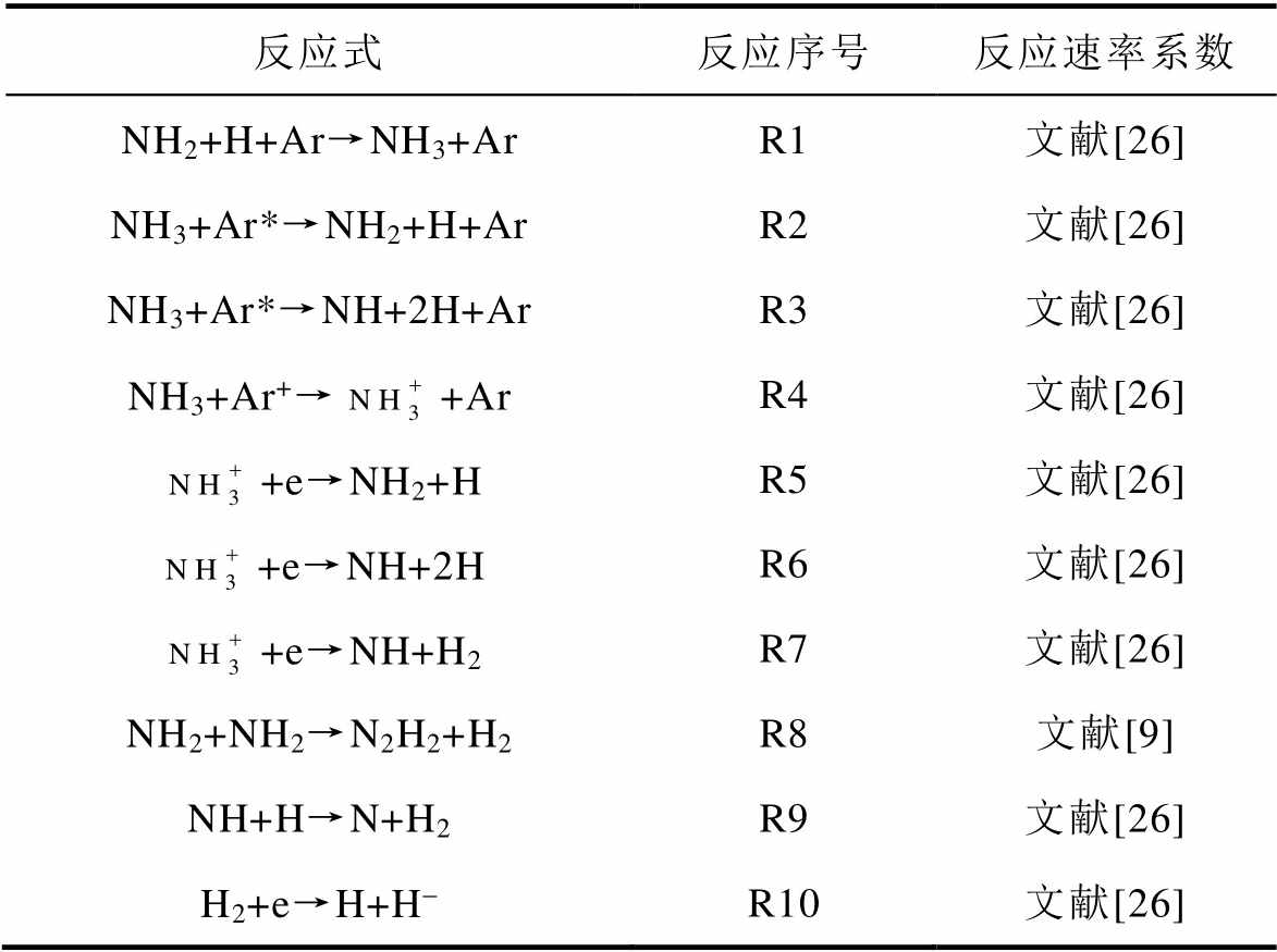 反应式反应序号反应速率系数 NH2+H+Ar→NH3+ArR1文献[26] NH3+Ar*→NH2+H+ArR2文献[26] NH3+Ar*→NH+2H+ArR3文献[26] NH3+Ar+→+ArR4文献[26] +e→NH2+HR5文献[26] +e→NH+2HR6文献[26] +e→NH+H2R7文献[26] NH2+NH2→N2H2+H2R8文献[9] NH+H→N+H2R9文献[26] H2+e→H+H-R10文献[26]