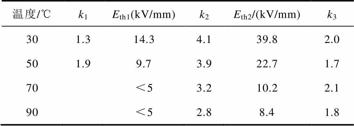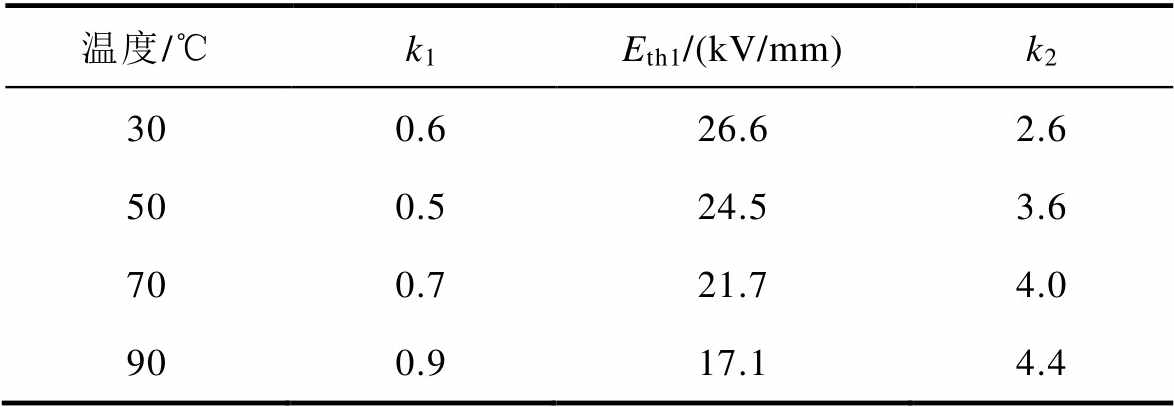 温度/℃k1Eth1(kV/mm)k2Eth2/(kV/mm)k3 301.314.34.139.82.0 501.99.73.922.71.7 70<53.210.22.1 90<52.88.41.8