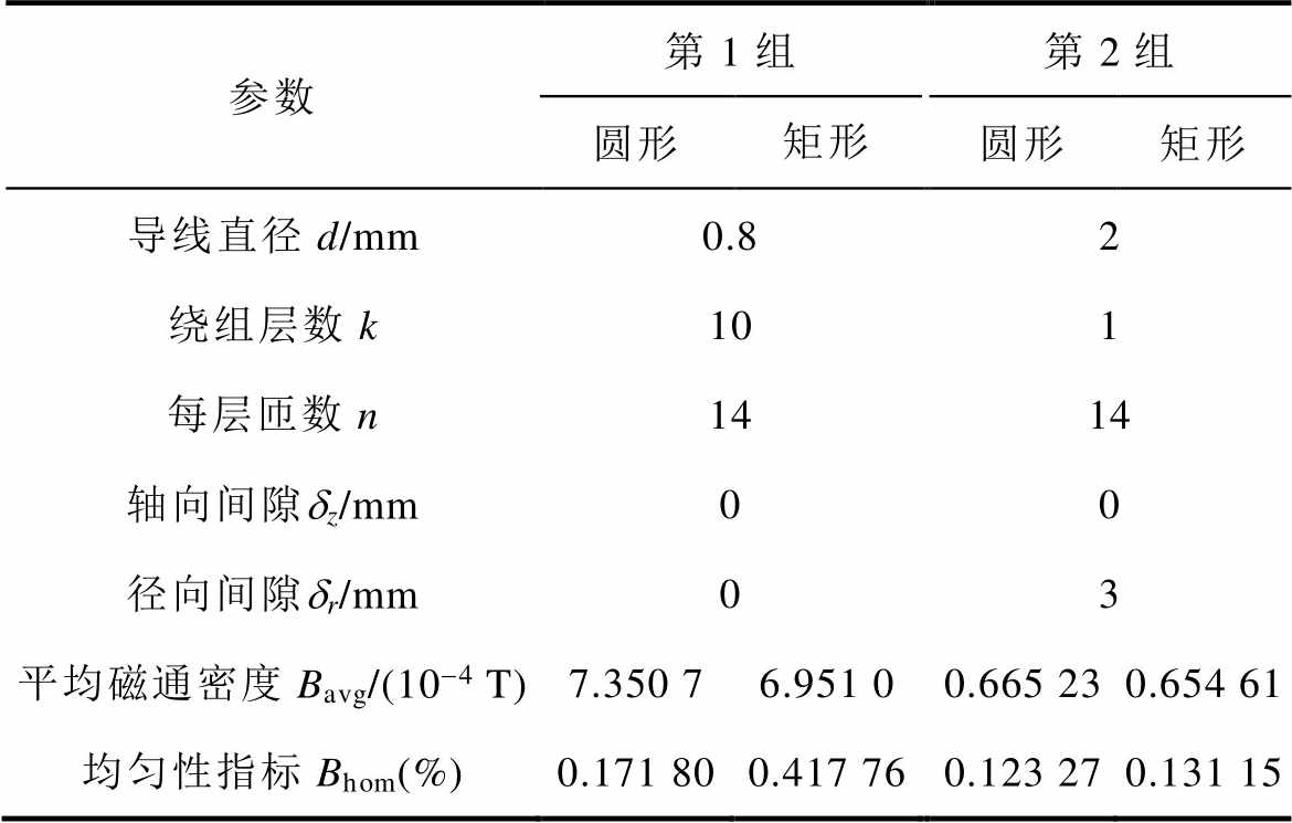 参数第1组第2组 圆形矩形圆形矩形 导线直径d/mm0.82 绕组层数k101 每层匝数n1414 轴向间隙dz/mm00 径向间隙dr/mm03 平均磁通密度Bavg/(10-4 T)7.350 76.951 00.665 230.654 61 均匀性指标Bhom(%)0.171 800.417 760.123 270.131 15