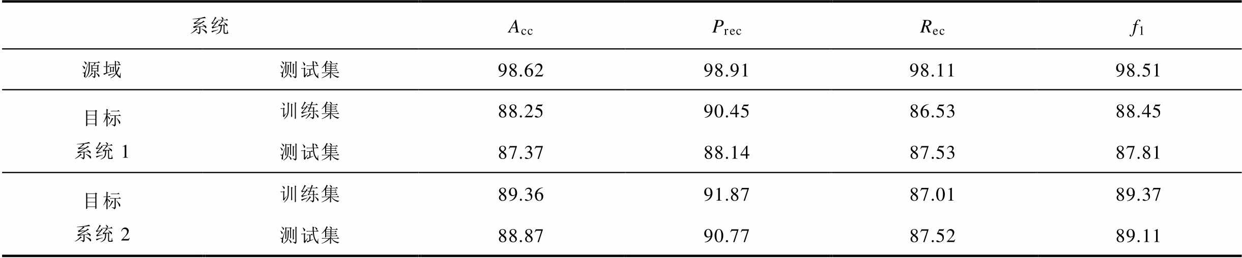 系统AccPrecRecf1 源域测试集98.6298.9198.1198.51 目标系统1训练集88.2590.4586.5388.45 测试集87.3788.1487.5387.81 目标系统2训练集89.3691.8787.0189.37 测试集88.8790.7787.5289.11