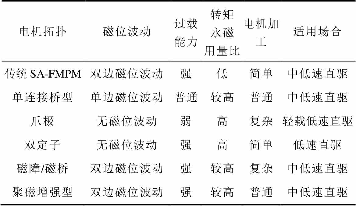 附加磁动势抑制思路独立性三种思路的相关性与思路Ⅰ相关性与思路Ⅱ相关性与思路Ⅲ相关性 Ⅰ:降低磁位波动思路Ⅰ仅是对磁导单元的改进,不涉及对励磁、电枢单元的构造。该思路下形成的部分结构设计可以使磁位波动降至零,效果显著。(1)三种思路都是对励磁单元和磁导单元的改进,而与电枢单元无关;这符合附加磁动势的产生原因是集总磁导变化和铁磁极磁位不等,而与绕组具体构造方式无关。(2)三种思路下形成的拓扑在结构特点方面的交集在于:在磁钢下方会增设附加铁轭将一半或所有铁磁极相连。——— Ⅱ:磁障/磁桥设计(1)合理的磁障设计能提升磁导L(q, t)对磁场的调制效果,思路Ⅱ能有效地降低附加磁动势,但无法降低为零,工作磁场谐波含量仍会降低,通过复合励磁单元(磁桥设计)产生更高的磁动势常规分量Fcom幅值以进行补偿。磁桥设计中辅助永磁体的放置与尺寸受磁障的形状与尺寸限制。(2)思路Ⅱ是对励磁单元和磁导单元的共同设计,相比思路Ⅰ和Ⅲ,对于磁场谐波的组成与含量会产生更大的影响。思路Ⅱ、Ⅲ均可视为是在思路Ⅰ基础上的进一步演化,均能直接降低励磁磁动势中振荡分量Fadd_1和Fadd_2幅值(即降低磁位波动)。思路Ⅱ、Ⅲ下形成的新型励磁结构都有一部分基于“电磁复合”理论演化,因此均能提升磁动势常规分量Fcom幅值。 Ⅲ:磁钢排布优化思路Ⅲ主要是对励磁单元的设计,目的在于对磁动势常规分量Fcom幅值的提升,且该思路下的部分励磁结构会向着内置式永磁体结构演变。