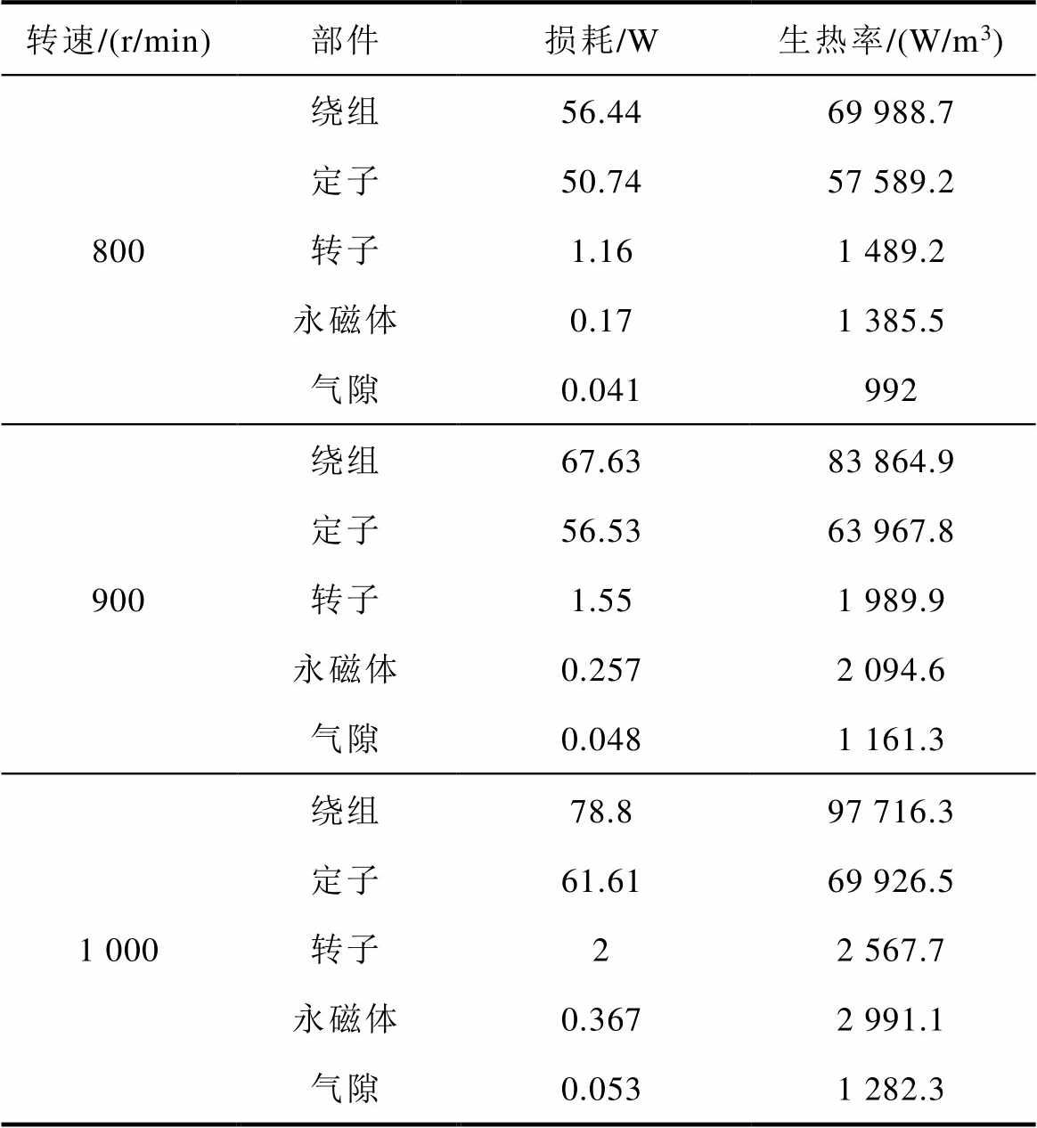 转速/(r/min)部件损耗/W生热率/(W/m3) 800绕组56.4469 988.7 定子50.7457 589.2 转子1.161 489.2 永磁体0.171 385.5 气隙0.041992 900绕组67.6383 864.9 定子56.5363 967.8 转子1.551 989.9 永磁体0.2572 094.6 气隙0.0481 161.3 1 000绕组78.897 716.3 定子61.6169 926.5 转子22 567.7 永磁体0.3672 991.1 气隙0.0531 282.3