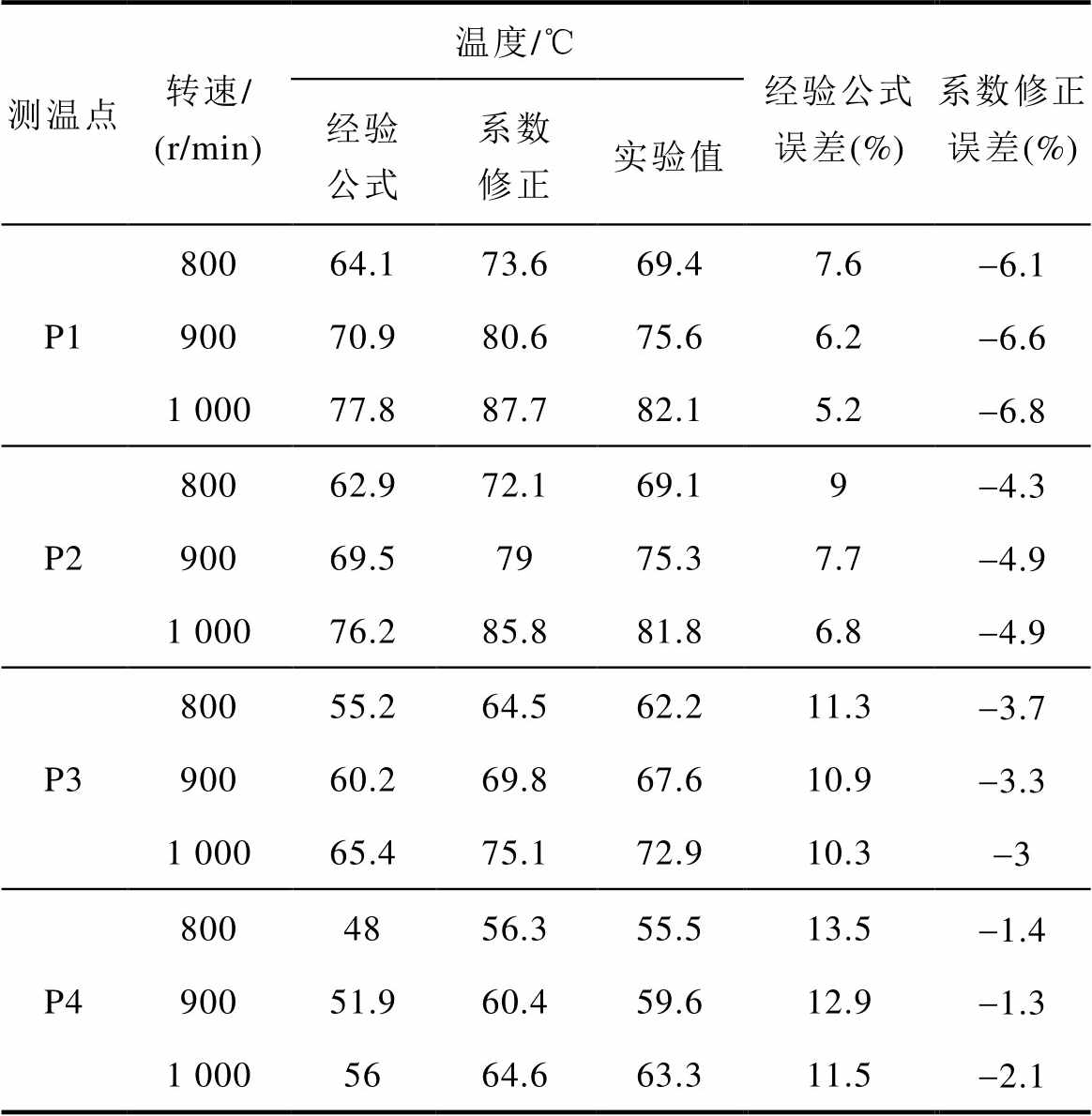 测温点转速/ (r/min)温度/℃经验公式误差(%)系数修正误差(%) 经验公式系数修正实验值 P180064.173.669.47.6-6.1 90070.980.675.66.2-6.6 1 00077.887.782.15.2-6.8 P280062.972.169.19-4.3 90069.57975.37.7-4.9 1 00076.285.881.86.8-4.9 P380055.264.562.211.3-3.7 90060.269.867.610.9-3.3 1 00065.475.172.910.3-3 P48004856.355.513.5-1.4 90051.960.459.612.9-1.3 1 0005664.663.311.5-2.1
