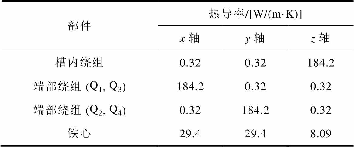 计算可得直角坐标系下电机温度场等效模型各坐标轴方向的材料热参数见表3。