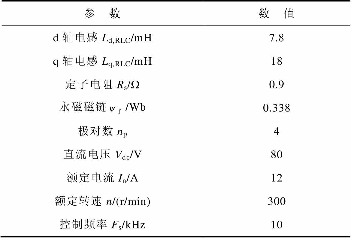 参 数数 值 d轴电感Ld,RLC/mH7.8 q轴电感Lq,RLC/mH18 定子电阻Rs/W0.9 永磁磁链/Wb0.338 极对数np4 直流电压Vdc/V80 额定电流In/A12 额定转速n/(r/min)300 控制频率Fs/kHz10