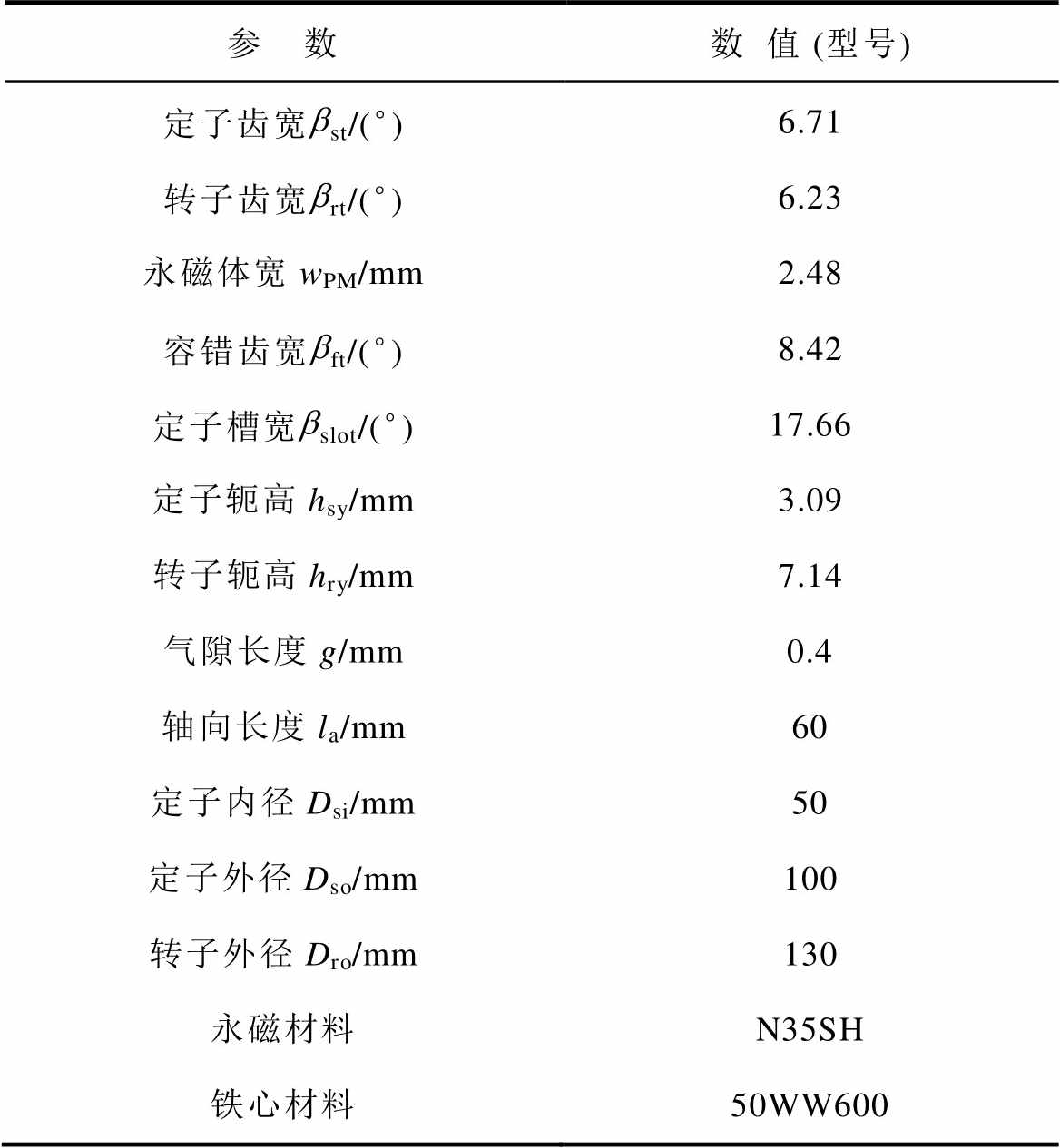 参 数数值 (型号) 定子齿宽bst/(°)6.71 转子齿宽brt/(°)6.23 永磁体宽wPM/mm2.48 容错齿宽bft/(°)8.42 定子槽宽bslot/(°)17.66 定子轭高hsy/mm3.09 转子轭高hry/mm7.14 气隙长度g/mm0.4 轴向长度la/mm60 定子内径Dsi/mm50 定子外径Dso/mm100 转子外径Dro/mm130 永磁材料N35SH 铁心材料50WW600