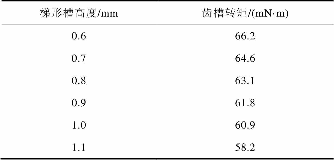 梯形槽高度/mm齿槽转矩/(mN·m) 0.666.2 0.764.6 0.863.1 0.961.8 1.060.9 1.158.2