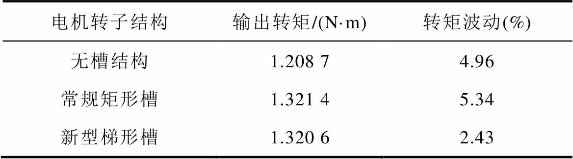 电机转子结构输出转矩/(N·m)转矩波动(%) 无槽结构1.208 74.96 常规矩形槽1.321 45.34 新型梯形槽1.320 62.43