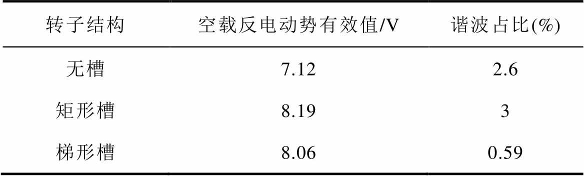 转子结构空载反电动势有效值/V谐波占比(%) 无槽7.122.6 矩形槽8.193 梯形槽8.060.59