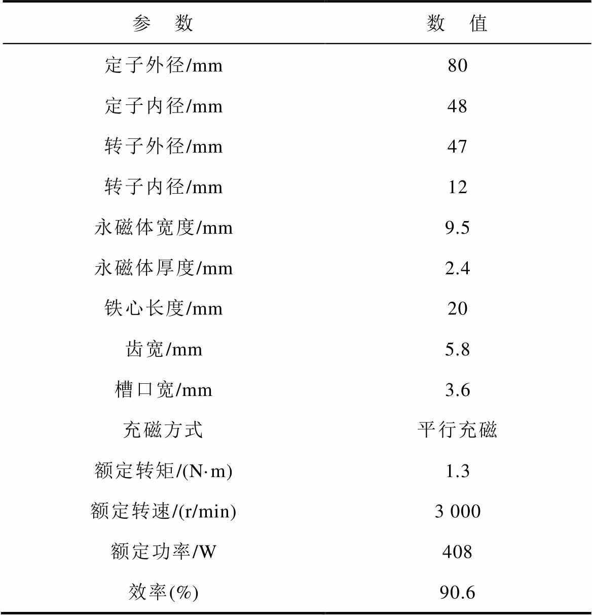 参 数数 值 定子外径/mm80 定子内径/mm48 转子外径/mm47 转子内径/mm12 永磁体宽度/mm9.5 永磁体厚度/mm2.4 铁心长度/mm20 齿宽/mm5.8 槽口宽/mm3.6 充磁方式平行充磁 额定转矩/(N·m)1.3 额定转速/(r/min)3 000 额定功率/W408 效率(%)90.6