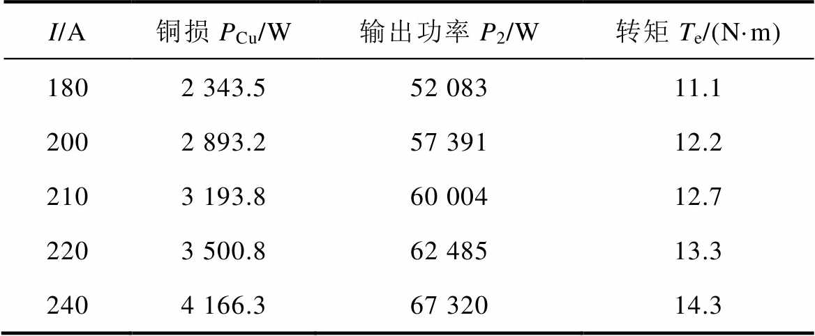 可见,电机铜损为447.0 W,小于最大铜损492.2 W,而相电流为127.0 A,与理论值125.8 A存在0.94%误差,因此验证了此分析方法的合理性。