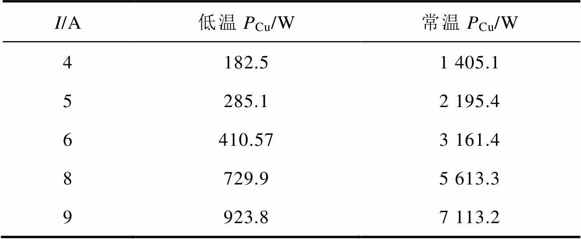 为了验证上述分析的合理性,制作了一台带Y型槽内流道的液冷电机,具体参数见表1。在其工作过程中需保证冷却介质保持某一流速从入口流入,从出口流出,因此需要将其与液氮泵接出端相连,在固定的泵压下进行实验,实验电机定子如图11所示。由于实验采用三相交流源电流最大仅为10 A,采用绕组形式的方法对铜损进行等效设计,再加上低温下电阻率的改变,最终两流道结构铜损与电流对应见表3。