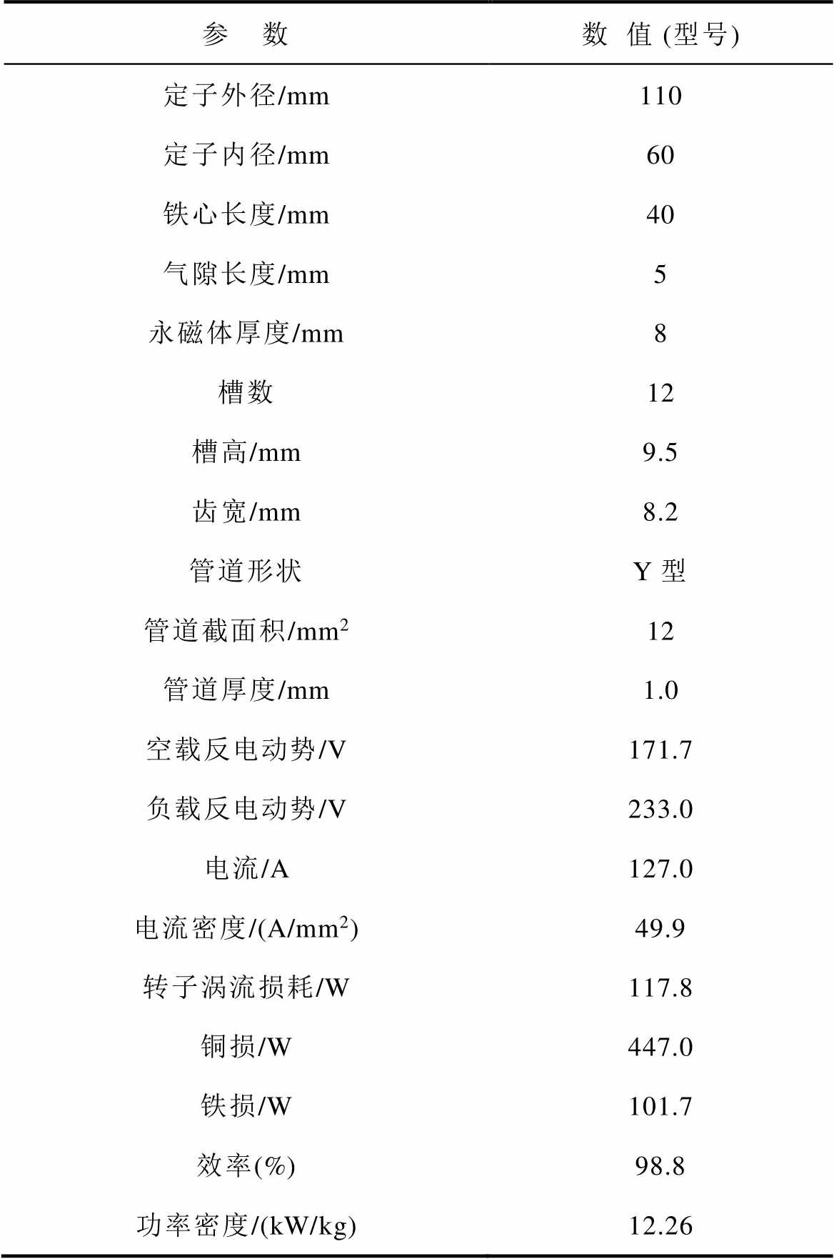 参 数数值 (型号) 定子外径/mm110 定子内径/mm60 铁心长度/mm40 气隙长度/mm5 永磁体厚度/mm8 槽数12 槽高/mm9.5 齿宽/mm8.2 管道形状Y型 管道截面积/mm212 管道厚度/mm1.0 空载反电动势/V171.7 负载反电动势/V233.0 电流/A127.0 电流密度/(A/mm2)49.9 转子涡流损耗/W117.8 铜损/W447.0 铁损/W101.7 效率(%)98.8 功率密度/(kW/kg)12.26