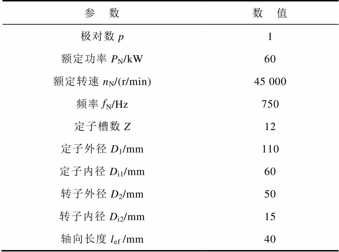 参 数数 值 极对数p1 额定功率PN/kW60 额定转速nN/(r/min)45 000 频率fN/Hz750 定子槽数Z12 定子外径D1/mm110 定子内径Di1/mm60 转子外径D2/mm50 转子内径Di2/mm15 轴向长度lef/mm40