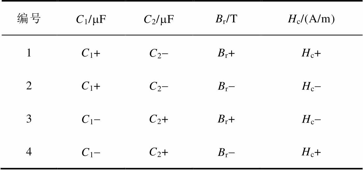 在补偿电容C1、C2容差±10%,磁参数Br、Hc分散性±20%下,取极限偏差对优化前后设计方案的保护特性进行仿真分析。C1、C2呈正相关的匹配关系,在取极限偏差时,C1、C2的偏差趋势应相反,因此每个方案共有(C1、C2)、Br、Hc三个因素,每个因素有正负两个偏差水平,采用L4(23)的正交表进行设计,见表5,并对结果进行统计分析。表中,C1+、C1-分别为C1容值偏差+10%和偏差-10%,C2+、C2-同理;Br+、Br-分别为剩磁偏差+20%和偏差-20%,Hc+、Hc-同理。根据表4对全部设计方案进行仿真分析,结果见附表1。