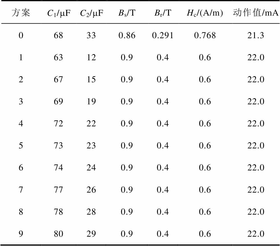 图12中交点是根据表2铁心磁参数进行补偿电容匹配设计的。图中黑色曲线较平稳,在该组电容参数下动作值受磁参数的影响最小。根据仿真结果,Bs变化对动作值影响最小,在变化范围内动作值仍能保持在20~25 mA,相比之下,Br和Hc的变化导致动作值波动超出了这一范围,尤其Br的变化使得动作值甚至超过了额定剩余动作电流,因此剩余电流互感器磁参数中饱和磁通密度Bs对动作值影响最小,矫顽力Hc次之,剩磁Br对动作值影响最大。