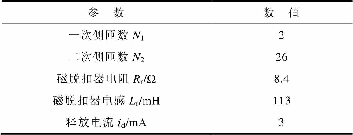 参 数数 值 一次侧匝数N12 二次侧匝数N226 磁脱扣器电阻Rr/W8.4 磁脱扣器电感Lr/mH113 释放电流id/mA3