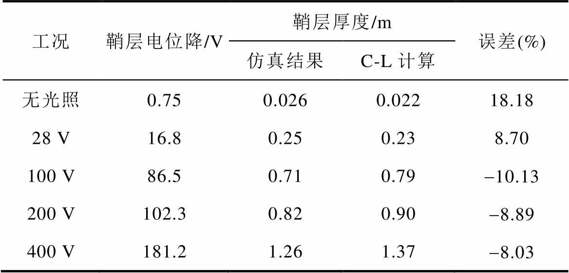 工况鞘层电位降/V鞘层厚度/m误差(%) 仿真结果C-L计算 无光照0.750.0260.02218.18 28 V16.80.250.238.70 100 V86.50.710.79-10.13 200 V102.30.820.90-8.89 400 V181.21.261.37-8.03