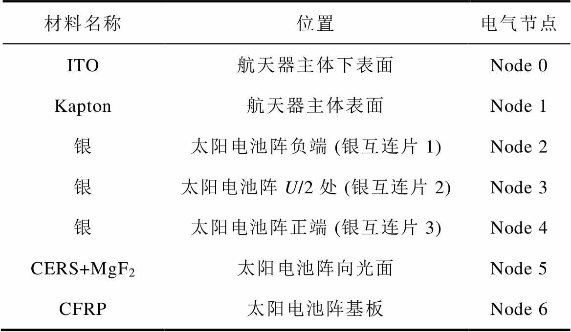 材料名称位置电气节点 ITO航天器主体下表面Node 0 Kapton航天器主体表面Node 1 银太阳电池阵负端 (银互连片1)Node 2 银太阳电池阵U/2处 (银互连片2)Node 3 银太阳电池阵正端 (银互连片3)Node 4 CERS+MgF2太阳电池阵向光面Node 5 CFRP太阳电池阵基板Node 6