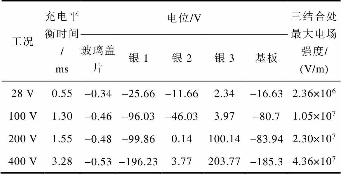 工况充电平衡时间/ ms电位/V三结合处最大电场强度/ (V/m) 玻璃盖片银1银2银3基板 28 V0.55-0.34-25.66-11.662.34-16.632.36×106 100 V1.30-0.46-96.03-46.033.97-80.71.05×107 200 V1.55-0.48-99.860.14100.14-83.942.30×107 400 V3.28-0.53-196.233.77203.77-185.34.36×107