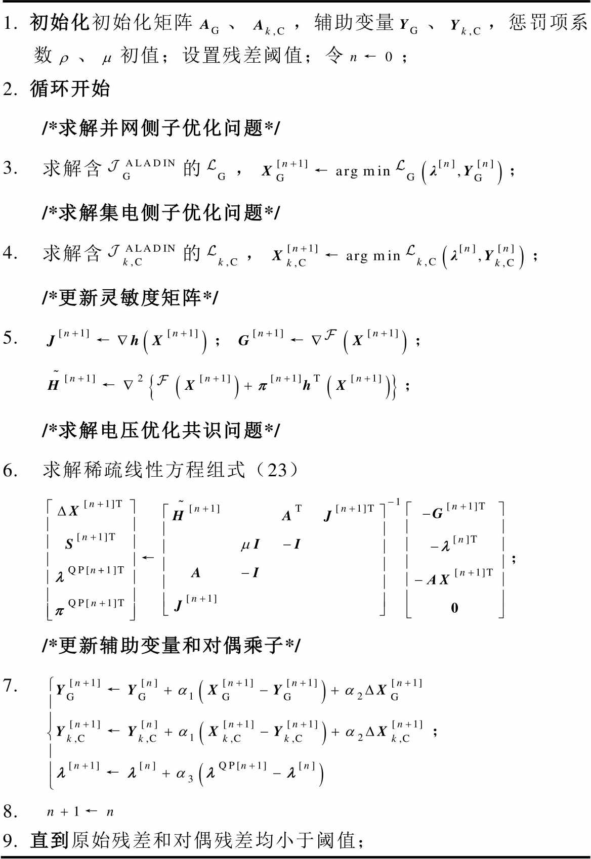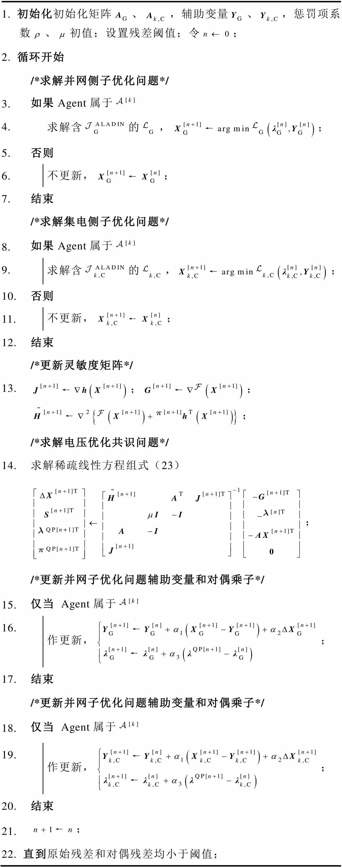 1. 初始化初始化矩阵、,辅助变量、,惩罚项系数、初值;设置残差阈值;令; 2. 循环开始 /*求解并网侧子优化问题*/ 3. 求解含的,; /*求解集电侧子优化问题*/ 4. 求解含的,; /*更新灵敏度矩阵*/ 5. ;;; /*求解电压优化共识问题*/ 6. 求解稀疏线性方程组式(23); /*更新辅助变量和对偶乘子*/ 7. ; 8. 9. 直到原始残差和对偶残差均小于阈值;