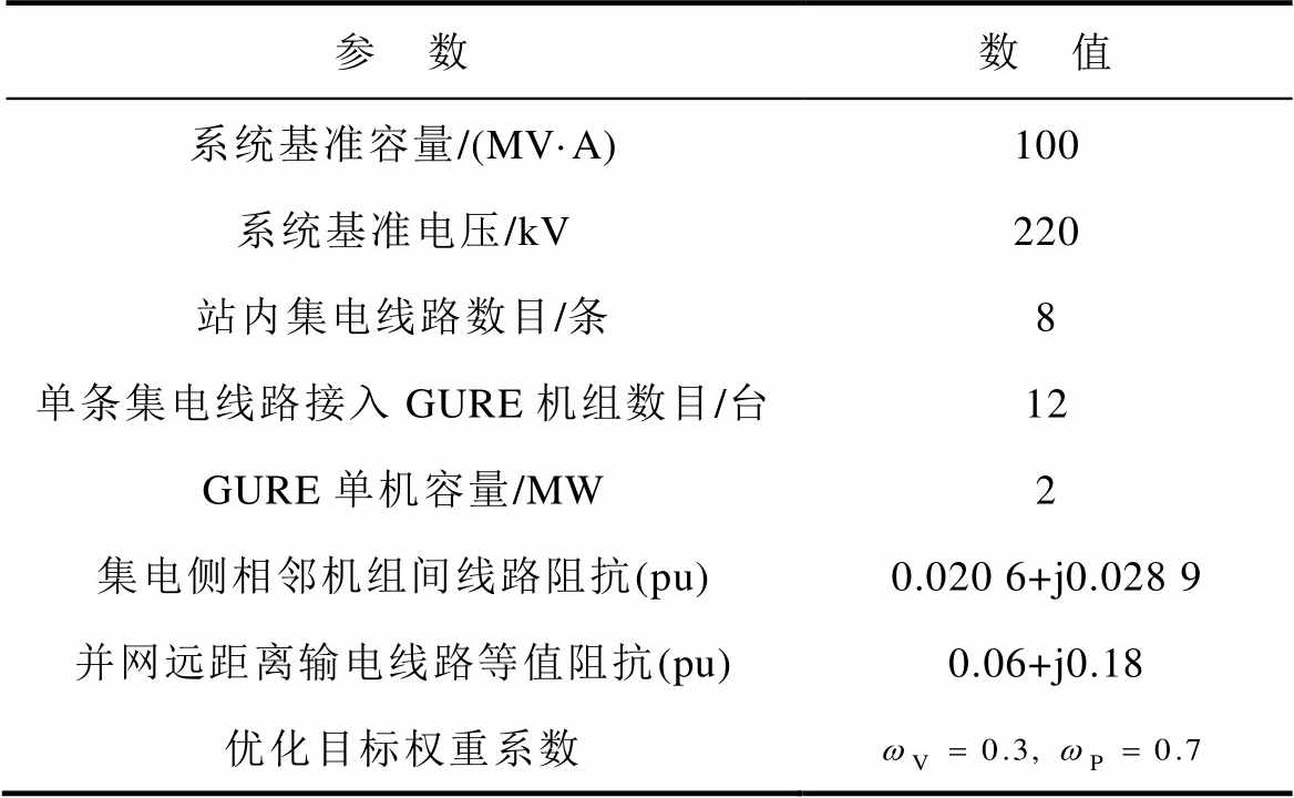 总结大型可再生能源电站“规模化拓扑、弱电网并入”的运行特征:对于系统外部并网侧,由于可再生能源电站远离负荷中心,电能外送的长距离输电线路使得系统普遍并入弱电网环境,并网侧戴维宁等效阻抗大;对于系统内部集电侧,大型可再生能源电站占地规模大,连接各GURE之间的中压集电线路较长,线路阻抗也较大。因此,当可再生能源电站进行规模化功率外送时,线路阻抗上的功率损耗较大,对系统电压分布的影响不可忽略。
