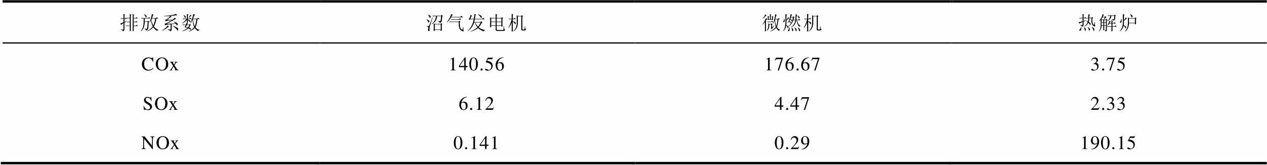 分别为沼气发电机、微燃机、热解炉的污染物单位排放量。污染物排放系数见表1[30-31]。
