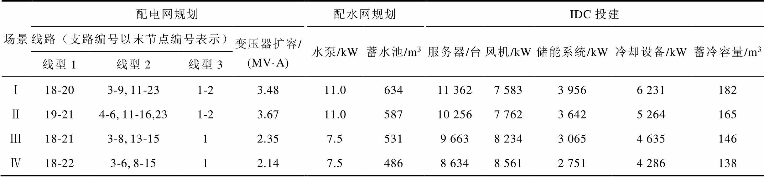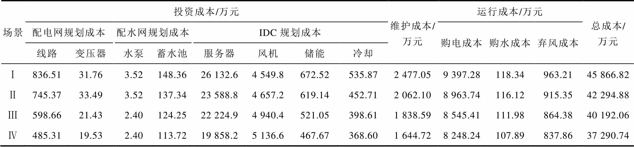 相较于前三个场景,场景Ⅳ全面地考虑到IDC与配电网和配水网协同规划,并且充分发挥IDC本身的灵活性,为配电网和配水网提供DR服务,由规划结果可知,总成本较场景Ⅲ降低了2 901.32万元。在该场景下灵活性资源实现了配电网和配水网电力负荷及水负荷的时空转移,在提高了配电网对可再生能源消纳能力的同时,达到了合理利用水资源的效益。