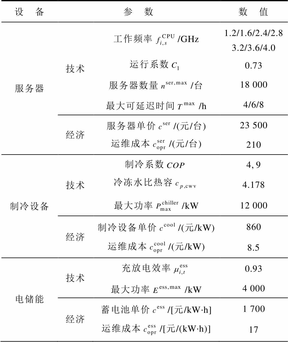 IDC的核心设备包括IT设备、制冷设备和辅助设备。IT设备中的服务器主要用于数据处理。制冷设备和电气设备与服务器的散热和优质供电密切相关,其功耗可以通过能源利用效率(Power Usage Effectiveness, PUE)指标来评估。IDC运行时通常会接收到交互性工作负载与批处理工作负载两种工作负载,前者要求立即进行处理,不具有可调性;而后者允许在一定时间范围内延迟处理。通过动态电压频率缩放(Dynamic Voltage Frequency Scaling, DVFS)技术,服务器可根据处理的工作负载强度对CPU的工作电压和工作频率进行灵活调节。