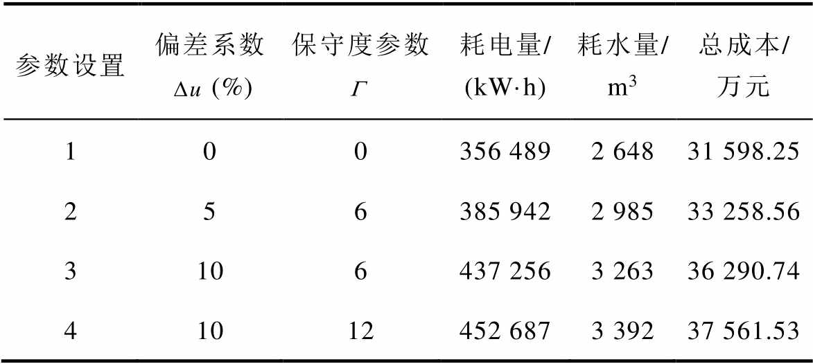 设定的影响,通过选取不同的偏差系数和保守度参数来分析对系统规划结果和耗电/水量的影响。不同鲁棒性下的日耗电及耗水量见表6。