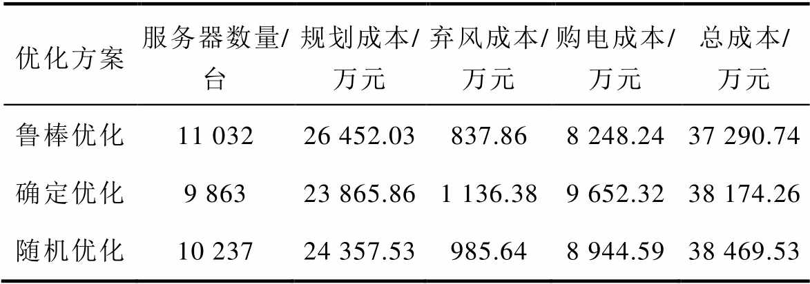 由表7可见,确定性优化下规划方案服务器数量和规划成本最低,但此规划方案由规划模型参数为确定值情况下得出,未考虑各类不确定性因素的影响,当实际运行参数偏离预测值时,其购电成本和弃风成本相对较高,实际工程中该方案适用性较差。随机优化方法下规划方案考虑了不确定性因素的影响,其规划成本低于鲁棒优化方案,但是方案的鲁棒性较差,当不确定性因素波动较大时,系统需花费高额的购电成本来补偿不确定性带来的供需功率不平衡,因此运行成本和总成本都较鲁棒优化方案高。而鲁棒优化方案由于在决策时便充分考虑了不确定性波动的影响,虽然初始投资成本稍高,但当其应用于含不确定性运行环境时,由于弃风成本和购电成本大幅降低,使得系统总体运行成本较低。因此本文规划方案相较其他方案具有更好的抗风险能力和总体经济性。