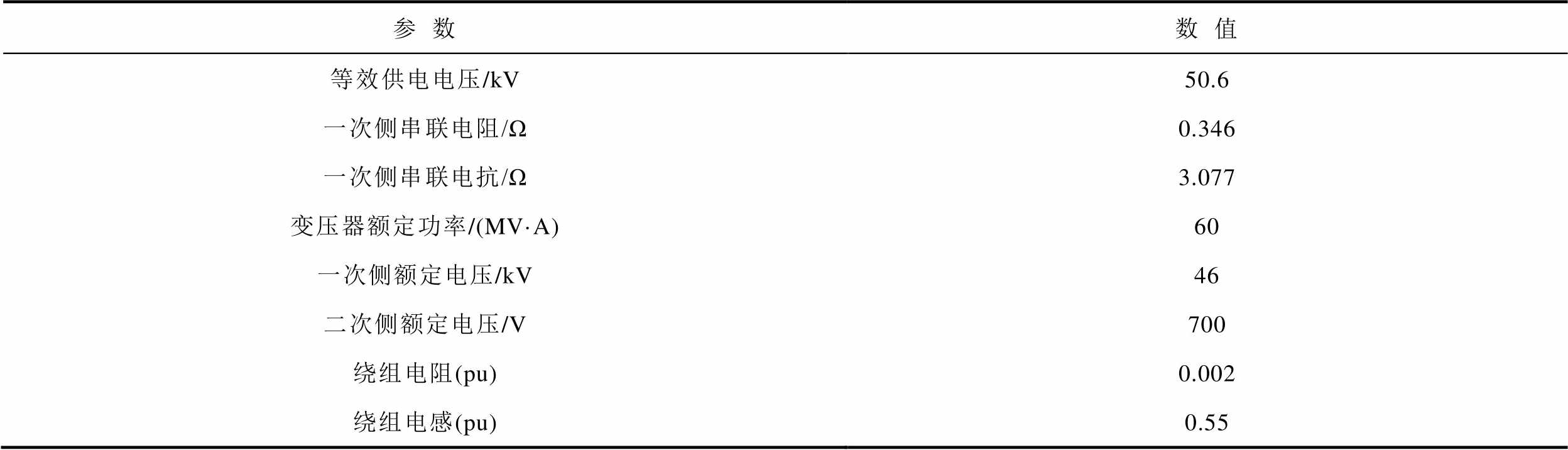 参数数值 等效供电电压/kV50.6 一次侧串联电阻/Ω0.346 一次侧串联电抗/Ω3.077 变压器额定功率/(MV·A)60 一次侧额定电压/kV46 二次侧额定电压/V700 绕组电阻(pu)0.002 绕组电感(pu)0.55