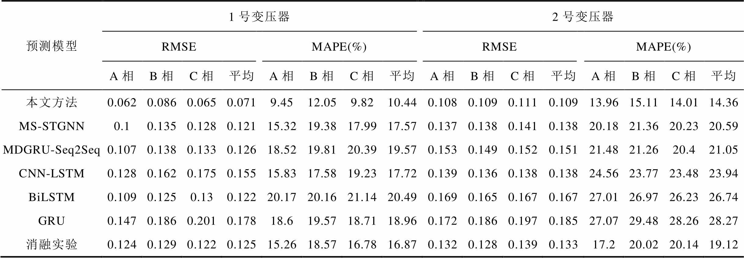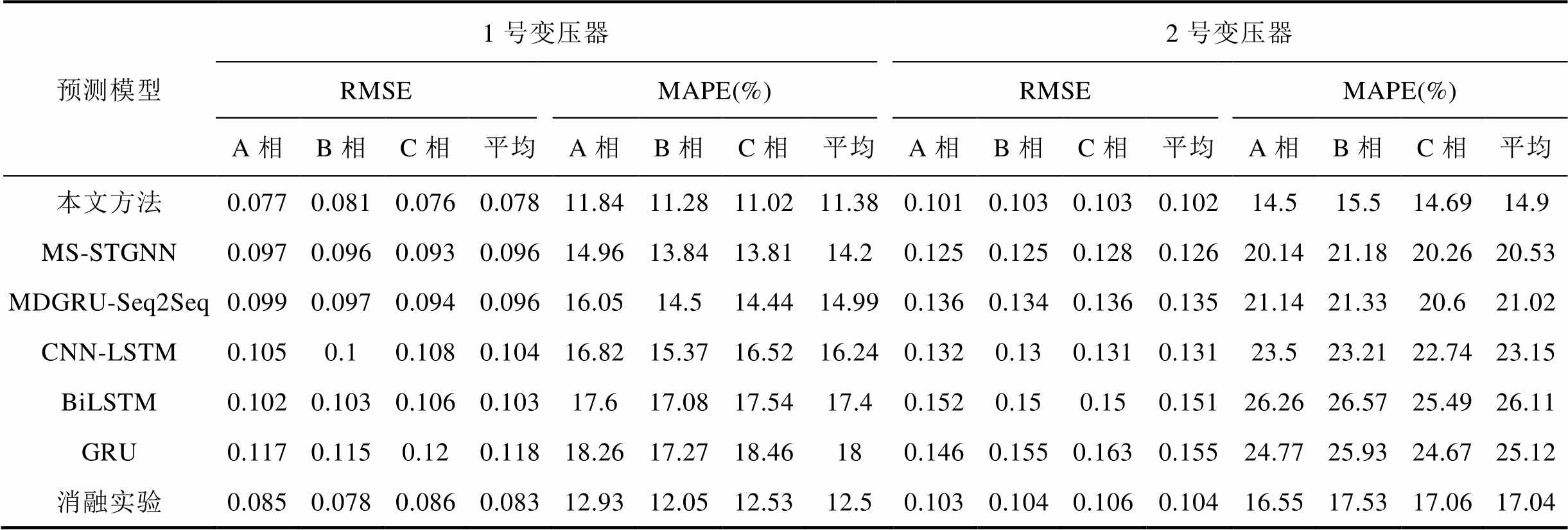 预测模型1号变压器2号变压器 RMSEMAPE(%)RMSEMAPE(%) A相B相C相平均A相B相C相平均A相B相C相平均A相B相C相平均 本文方法0.0620.0860.0650.0719.4512.059.8210.440.1080.1090.1110.10913.9615.1114.0114.36 MS-STGNN0.10.1350.1280.12115.3219.3817.9917.570.1370.1380.1410.13820.1821.3620.2320.59 MDGRU-Seq2Seq0.1070.1380.1330.12618.5219.8120.3919.570.1530.1490.1520.15121.4821.2620.421.05 CNN-LSTM0.1280.1620.1750.15515.8317.5819.2317.720.1390.1360.1380.13824.5623.7723.4823.94 BiLSTM0.1090.1250.130.12220.1720.1621.1420.490.1690.1650.1670.16727.0126.9726.2326.74 GRU0.1470.1860.2010.17818.619.5718.7118.960.1720.1860.1970.18527.0729.4828.2628.27 消融实验0.1240.1290.1220.12515.2618.5716.7816.870.1320.1280.1390.13317.220.0220.1419.12