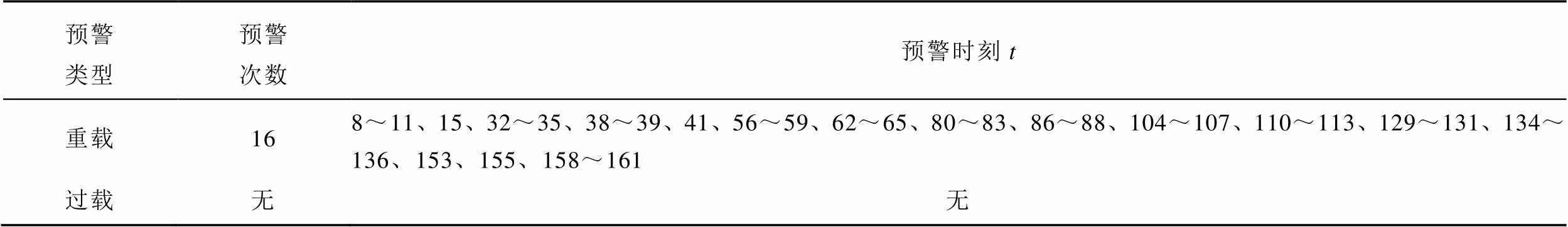 预警类型预警次数预警时刻t 重载168~11、15、32~35、38~39、41、56~59、62~65、80~83、86~88、104~107、110~113、129~131、134~136、153、155、158~161 过载无无