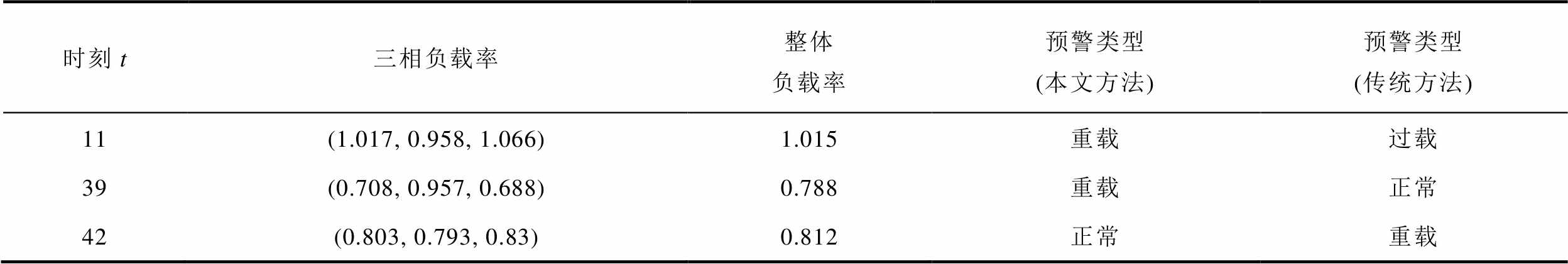 时刻t三相负载率整体负载率预警类型(本文方法)预警类型(传统方法) 11(1.017, 0.958, 1.066)1.015重载过载 39(0.708, 0.957, 0.688)0.788重载正常 42(0.803, 0.793, 0.83)0.812正常重载