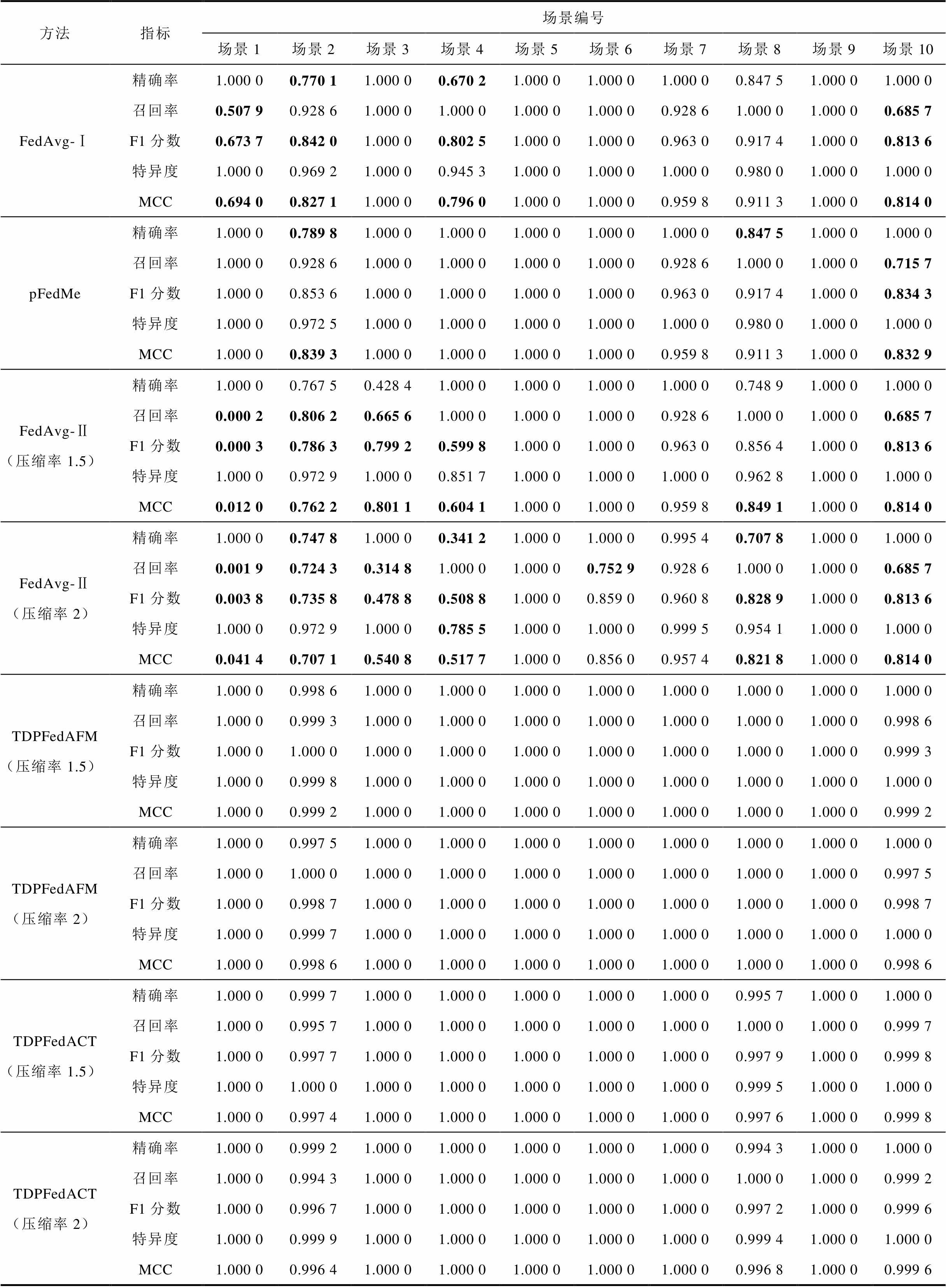 方法指标场景编号 场景1场景2场景3场景4场景5场景6场景7场景8场景9场景10 FedAvg-Ⅰ精确率1.000 00.77011.000 00.67021.000 01.000 01.000 00.847 51.000 01.000 0 召回率0.50790.928 61.000 01.000 01.000 01.000 00.928 61.000 01.000 00.6857 F1分数0.67370.84201.000 00.80251.000 01.000 00.963 00.917 41.000 00.8136 特异度1.000 00.969 21.000 00.945 31.000 01.000 01.000 00.980 01.000 01.000 0 MCC0.69400.82711.000 00.79601.000 01.000 00.959 80.911 31.000 00.8140 pFedMe精确率1.000 00.78981.000 01.000 01.000 01.000 01.000 00.84751.000 01.000 0 召回率1.000 00.928 61.000 01.000 01.000 01.000 00.928 61.000 01.000 00.7157 F1分数1.000 00.853 61.000 01.000 01.000 01.000 00.963 00.917 41.000 00.8343 特异度1.000 00.972 51.000 01.000 01.000 01.000 01.000 00.980 01.000 01.000 0 MCC1.000 00.83931.000 01.000 01.000 01.000 00.959 80.911 31.000 00.8329 FedAvg-Ⅱ(压缩率1.5)精确率1.000 00.767 50.428 41.000 01.000 01.000 01.000 00.748 91.000 01.000 0 召回率0.00020.80620.66561.000 01.000 01.000 00.928 61.000 01.000 00.6857 F1分数0.00030.78630.79920.59981.000 01.000 00.963 00.856 41.000 00.8136 特异度1.000 00.972 91.000 00.851 71.000 01.000 01.000 00.962 81.000 01.000 0 MCC0.01200.76220.80110.60411.000 01.000 00.959 80.84911.000 00.8140 FedAvg-Ⅱ(压缩率2)精确率1.000 00.74781.000 00.34121.000 01.000 00.995 40.70781.000 01.000 0 召回率0.00190.72430.31481.000 01.000 00.75290.928 61.000 01.000 00.6857 F1分数0.00380.73580.47880.50881.000 00.859 00.960 80.82891.000 00.8136 特异度1.000 00.972 91.000 00.78551.000 01.000 00.999 50.954 11.000 01.000 0 MCC0.04140.70710.54080.51771.000 00.856 00.957 40.82181.000 00.8140 TDPFedAFM(压缩率1.5)精确率1.000 00.998 61.000 01.000 01.000 01.000 01.000 01.000 01.000 01.000 0 召回率1.000 00.999 31.000 01.000 01.000 01.000 01.000 01.000 01.000 00.998 6 F1分数1.000 01.000 01.000 01.000 01.000 01.000 01.000 01.000 01.000 00.999 3 特异度1.000 00.999 81.000 01.000 01.000 01.000 01.000 01.000 01.000 01.000 0 MCC1.000 00.999 21.000 01.000 01.000 01.000 01.000 01.000 01.000 00.999 2 TDPFedAFM(压缩率2)精确率1.000 00.997 51.000 01.000 01.000 01.000 01.000 01.000 01.000 01.000 0 召回率1.000 01.000 01.000 01.000 01.000 01.000 01.000 01.000 01.000 00.997 5 F1分数1.000 00.998 71.000 01.000 01.000 01.000 01.000 01.000 01.000 00.998 7 特异度1.000 00.999 71.000 01.000 01.000 01.000 01.000 01.000 01.000 01.000 0 MCC1.000 00.998 61.000 01.000 01.000 01.000 01.000 01.000 01.000 00.998 6 TDPFedACT(压缩率1.5)精确率1.000 00.999 71.000 01.000 01.000 01.000 01.000 00.995 71.000 01.000 0 召回率1.000 00.995 71.000 01.000 01.000 01.000 01.000 01.000 01.000 00.999 7 F1分数1.000 00.997 71.000 01.000 01.000 01.000 01.000 00.997 91.000 00.999 8 特异度1.000 01.000 01.000 01.000 01.000 01.000 01.000 00.999 51.000 01.000 0 MCC1.000 00.997 41.000 01.000 01.000 01.000 01.000 00.997 61.000 00.999 8 TDPFedACT(压缩率2)精确率1.000 00.999 21.000 01.000 01.000 01.000 01.000 00.994 31.000 01.000 0 召回率1.000 00.994 31.000 01.000 01.000 01.000 01.000 01.000 01.000 00.999 2 F1分数1.000 00.996 71.000 01.000 01.000 01.000 01.000 00.997 21.000 00.999 6 特异度1.000 00.999 91.000 01.000 01.000 01.000 01.000 00.999 41.000 01.000 0 MCC1.000 00.996 41.000 01.000 01.000 01.000 01.000 00.996 81.000 00.999 6
