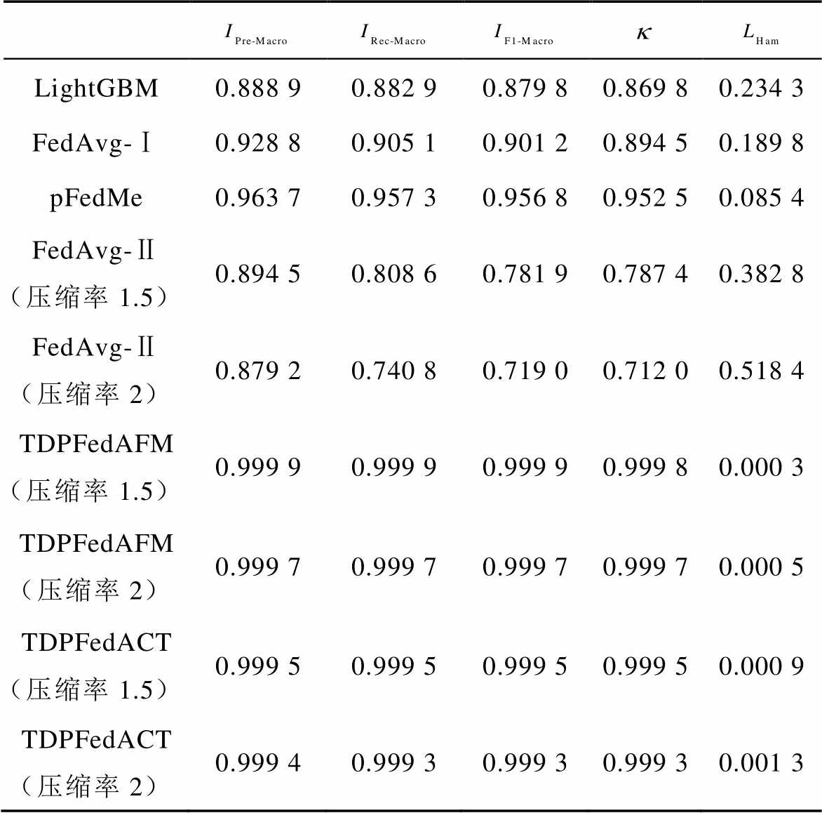 LightGBM0.88890.88290.87980.86980.2343 FedAvg-Ⅰ0.92880.90510.90120.89450.1898 pFedMe0.96370.95730.95680.95250.0854 FedAvg-Ⅱ(压缩率1.5)0.89450.80860.78190.78740.3828 FedAvg-Ⅱ(压缩率2)0.87920.74080.71900.71200.5184 TDPFedAFM(压缩率1.5)0.99990.99990.99990.99980.0003 TDPFedAFM(压缩率2)0.99970.99970.99970.99970.0005 TDPFedACT(压缩率1.5)0.99950.99950.99950.99950.0009 TDPFedACT(压缩率2)0.99940.99930.99930.99930.0013