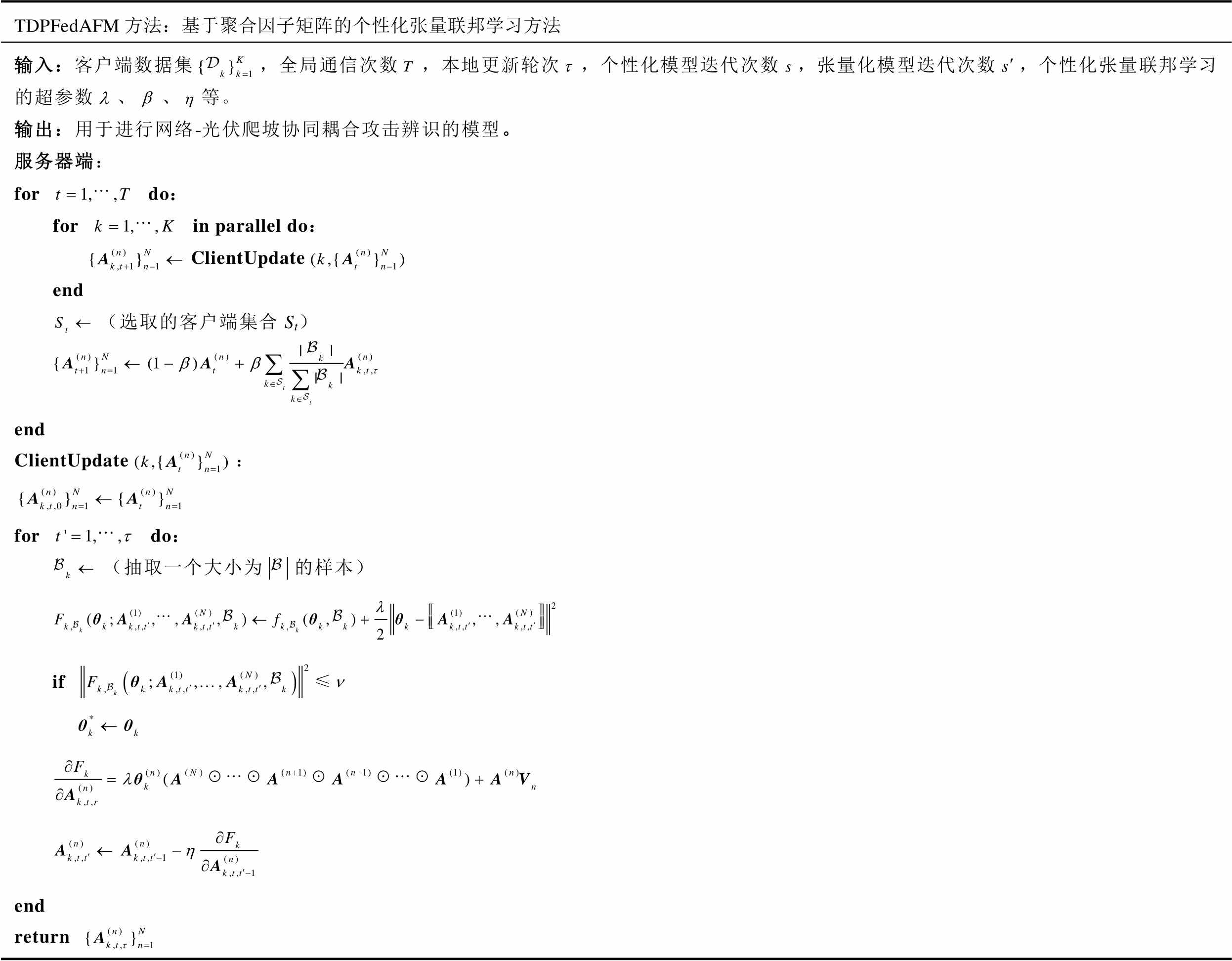 针对上述问题,本文提出基于张量分解个性化联邦学习(Tensor Decomposition based Personalized Federated learning, TDPFed)的网络-光伏爬坡协同攻击辨识方法,在保护数据隐私的同时实现对各类网络-光伏爬坡协同攻击的辨识。首先,分析网络-光伏爬坡协同攻击路径,构建网络-光伏爬坡协同攻击模型并分析攻击原理;其次,使用张量分解对传统联邦学习进行改进,提出一种张量分解个性化联邦学习方法用于网络-光伏爬坡协同攻击辨识,实现面向海量数据的高效训练;然后,基于光伏出力特点和不同攻击方式提出10种网络-光伏爬坡协同攻击的典型场景,并生成大量样本用于仿真验证;最后,通过大量算例分析证明了本文方法具有收敛速度快、FDIA辨识准确度高、误报率低的优势,能够有效地减少通信资源需求,为大电网多节点系统进行联邦学习和解决网络-光伏爬坡协同攻击辨识问题提供有效方案。