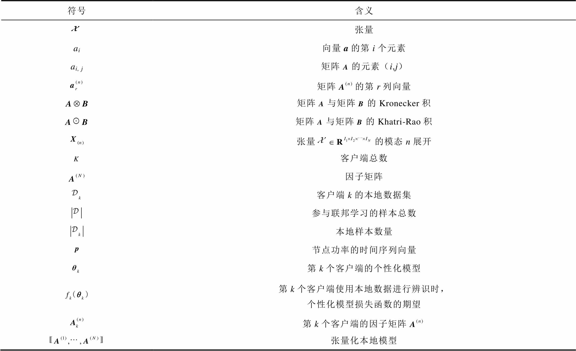 符号含义 张量 ai向量a的第i个元素 ai, j矩阵的元素(i,j) 矩阵的第r列向量 矩阵与矩阵的Kronecker积 矩阵与矩阵的Khatri-Rao积 张量的模态n展开 客户端总数 因子矩阵 客户端k的本地数据集 参与联邦学习的样本总数 本地样本数量 节点功率的时间序列向量 第k个客户端的个性化模型 第k个客户端使用本地数据进行辨识时,个性化模型损失函数的期望 第k个客户端的因子矩阵 张量化本地模型