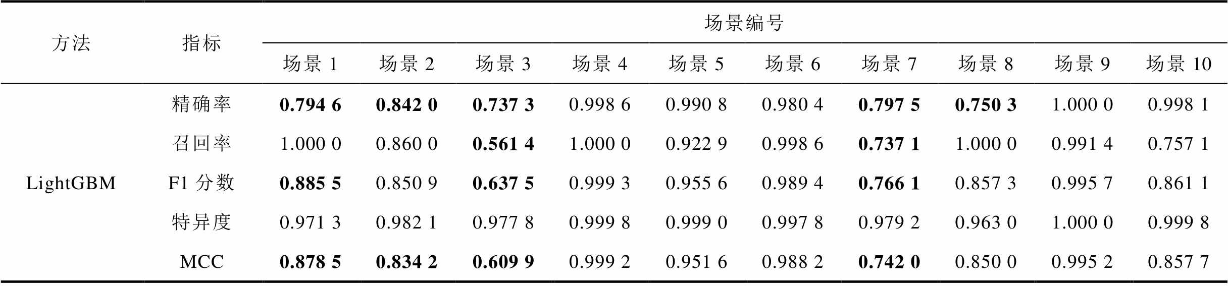 方法指标场景编号 场景1场景2场景3场景4场景5场景6场景7场景8场景9场景10 LightGBM精确率0.79460.84200.73730.998 60.990 80.980 40.79750.75031.000 00.998 1 召回率1.000 00.860 00.56141.000 00.922 90.998 60.73711.000 00.991 40.757 1 F1分数0.88550.850 90.63750.999 30.955 60.989 40.76610.857 30.995 70.861 1 特异度0.971 30.982 10.977 80.999 80.999 00.997 80.979 20.963 01.000 00.999 8 MCC0.87850.83420.60990.999 20.951 60.988 20.74200.850 00.995 20.857 7